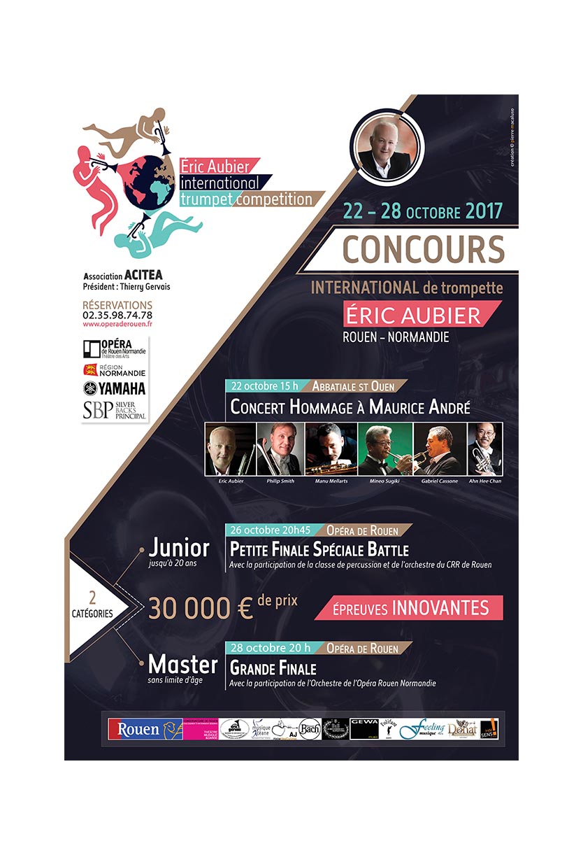 Open to different aesthetics, he has played and recorded Toot Suite by Claude Bolling, with the most active jazz musicians: André Ceccarelli, Riccardo Del Fra and Hervé Sellin. He also devotes part of his activities to the direction of large wind or brass ensembles. Eric Aubier has recorded a hundred works from the Baroque to the present day, with various formations. Among the essential pieces of the repertoire: Concertos Brandebourgeois by JS Bach, Haydn, Hummel, Telemann, Mozart, Boehme, Brandt, Escaich, Françaix, Beffa, Escaich, Tomasi, Jolivet, Enesco, Copland, Planel, Arutiunian, Jevtic, Shostakovich. 2014 marks the creation of the first international trumpet competition bearing his name, in Colombia.